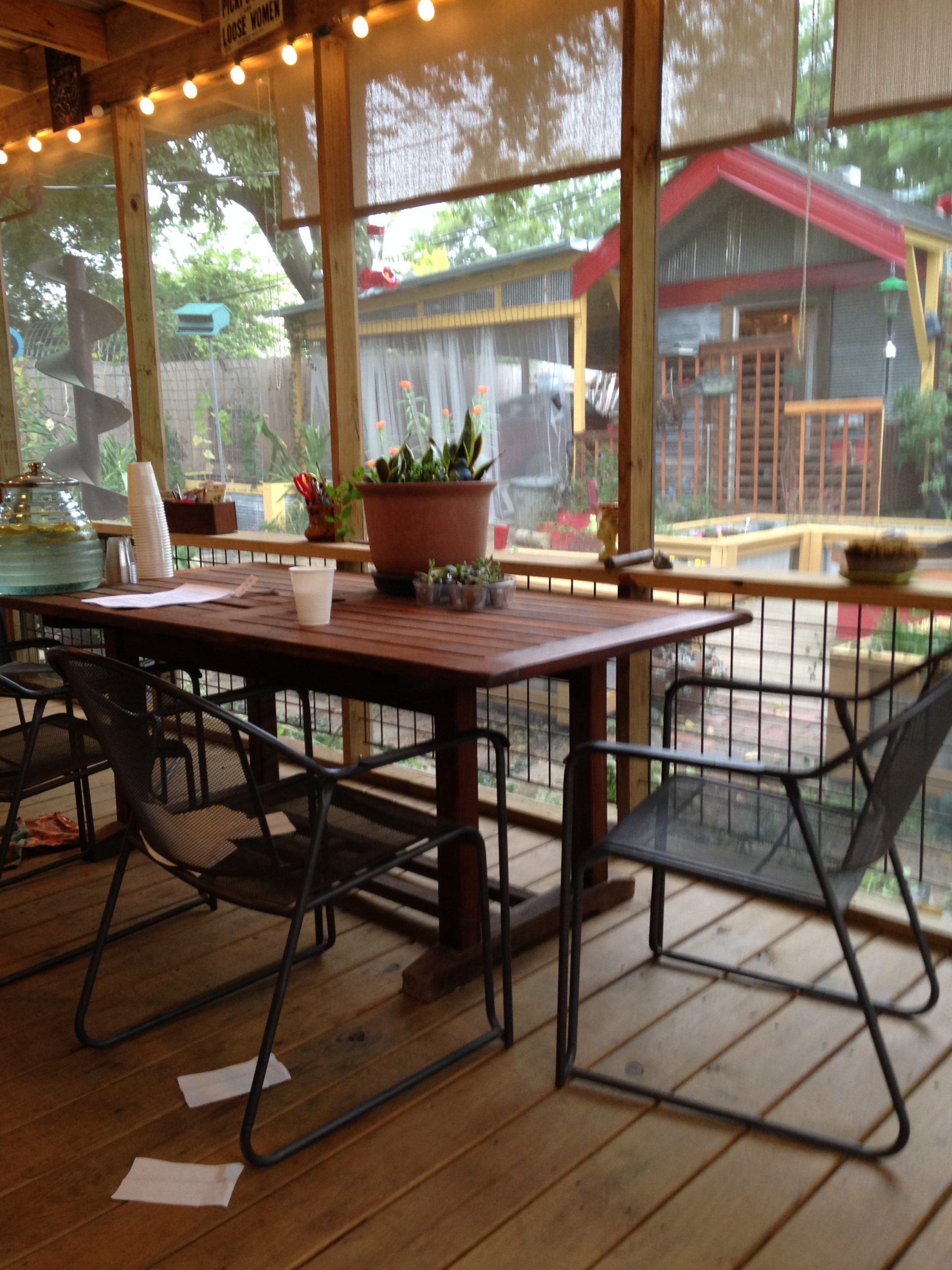 Consider colorful curtains or netting for a sense of privacy and cosiness. Add containers, hanging baskets, vines, or banana plants for additional privacy.